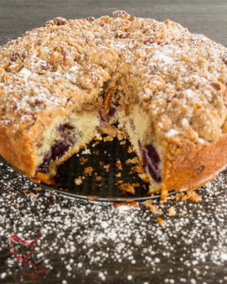 Kurze Beschreibung: Ein saftiger Käsekuchen mit Apfelstücken und Zimtstreuseln – …
