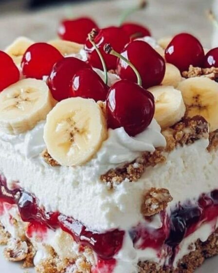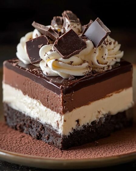 Ein saftiger Schichtkuchen mit cremiger Kokos-Grieß-Füllung und schokoladigem Boden – …