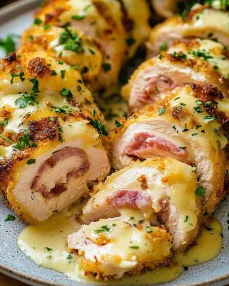 Zutaten:4 Hähnchenbrustfilets8 Scheiben Schinken8 Scheiben Emmentaler Käse2 Eier1 Tasse PaniermehlSalz …