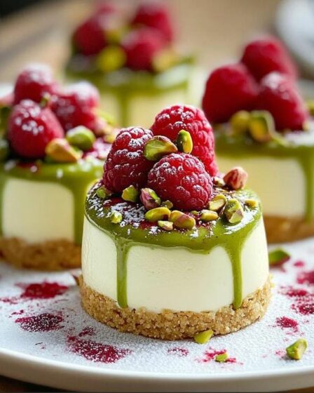 Pistazien-Himbeer-Käsekuchen-Kuppeln Für die Käsekuchen-Füllung: 250g Frischkäse (erweicht) 🧀100 g Puderzucker …
