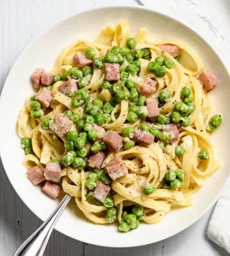 Spaghetti alla Panna in Käse Sahnesauce mit Schinken und Erbsen