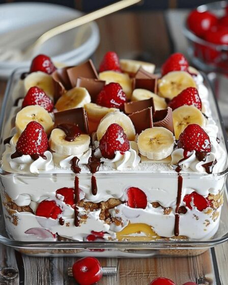 Einführung: Diese Bananensplit-Torte ohne Backen ist eine himmlische Süßspeise, die …