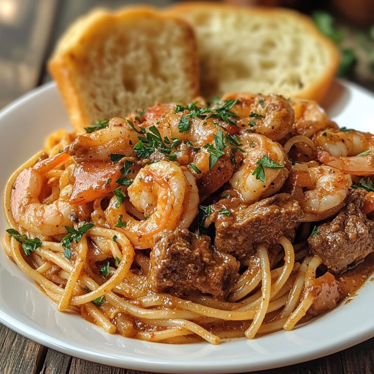Cremige Spaghetti mit Rindfleisch und Garnelen in Cajun-Sauce