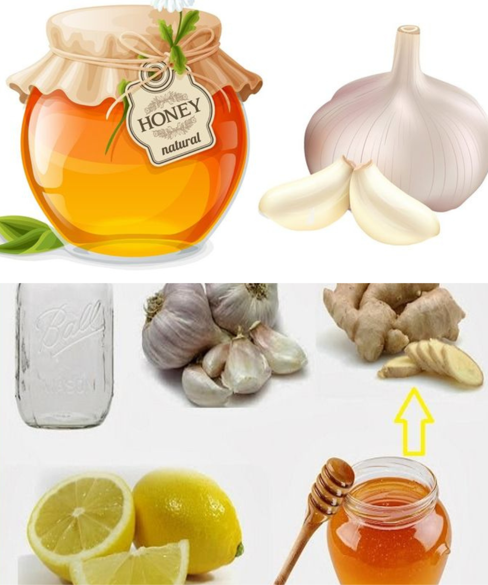 Natürliche Stärkung des Immunsystems mit Zwiebeln, Ingwer und Knoblauch in Honig