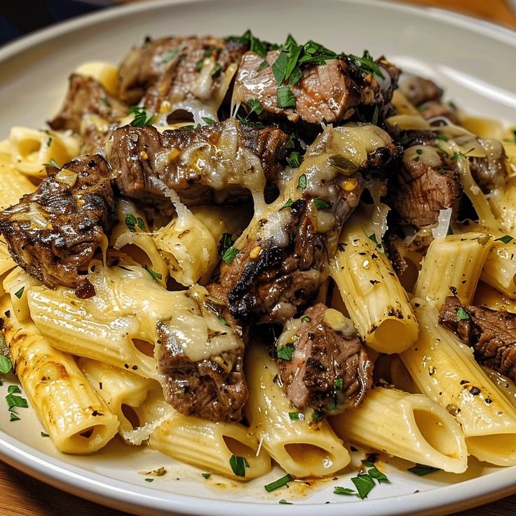 Köstliche Steakspitzen in Knoblauchbutter mit Käse-Rigatoni
