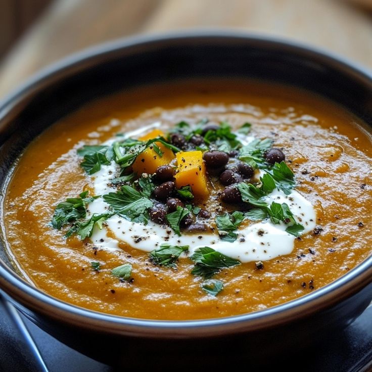 Schwarze Bohnen-Kürbis-Butternusskürbis-Suppe mit Frischkäse
