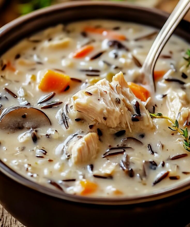 Cremige Hühnersuppe mit Pilzen und Wildreis