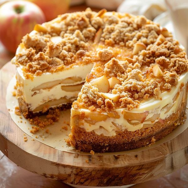 Kurze Beschreibung: Ein saftiger Käsekuchen mit Apfelstücken und Zimtstreuseln – …