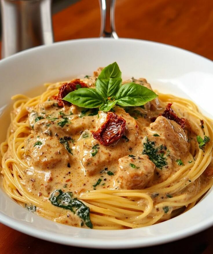 Spaghetti & Spinat mit Sahnesauce aus sonnengetrockneten Tomaten
