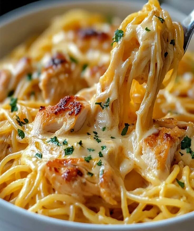 Cremige Hähnchen-Spaghetti mit drei Käsesorten und Pfiff
