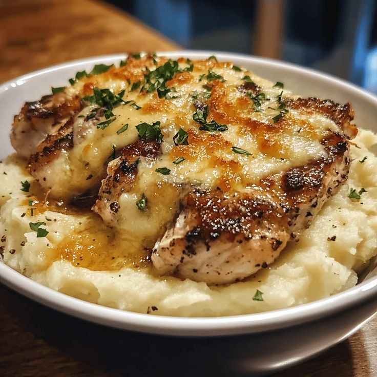 Hähnchen-Steak-Auflauf mit Knoblauch-Parmesan und Käse-Kartoffelpüree