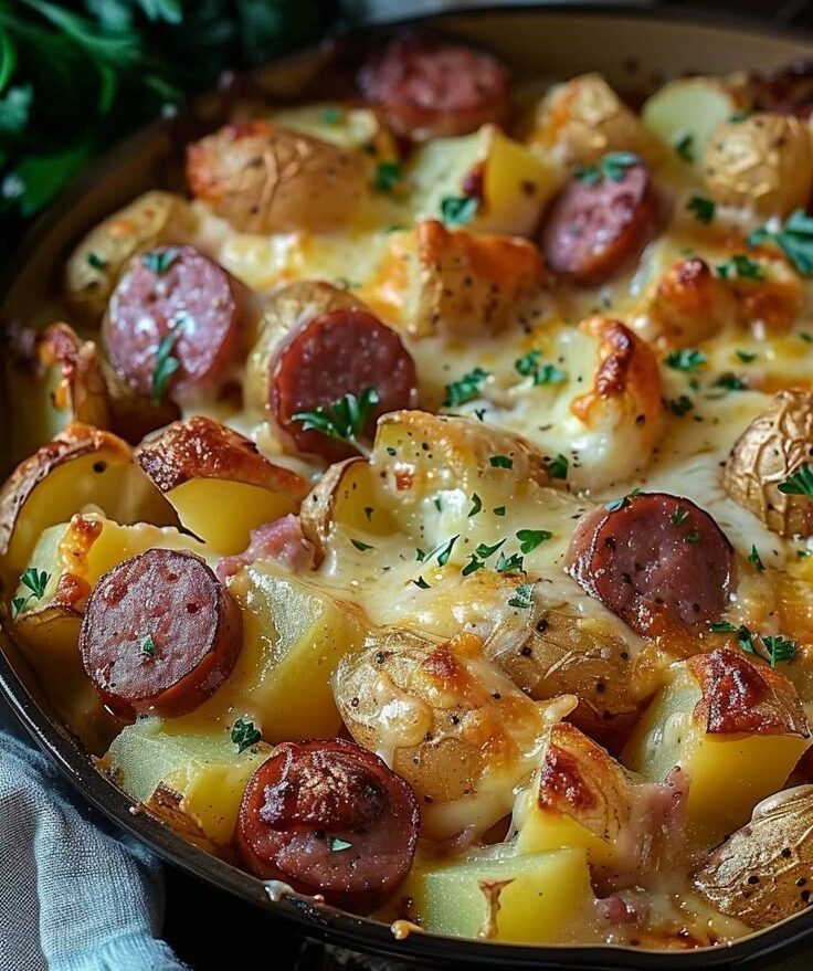 Cremiger Käse-Kartoffel-Genuss mit pikanter geräucherter Wurst Zutaten: Zubereitung: Backofen auf …