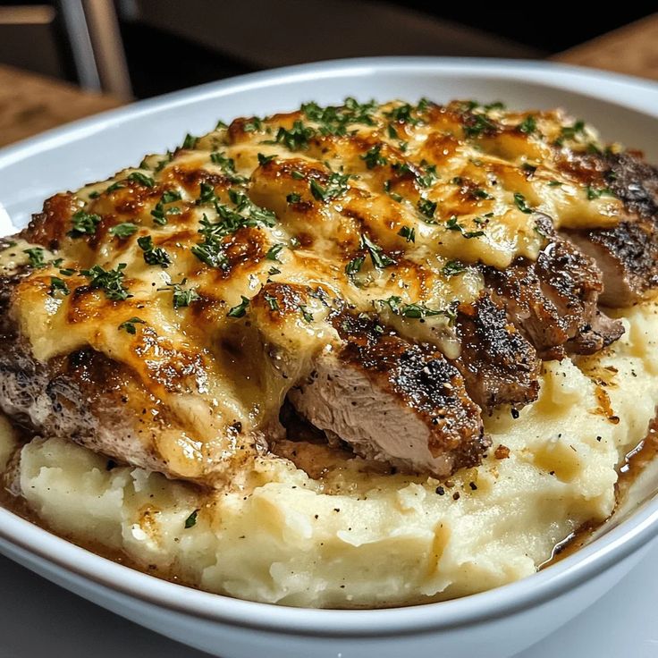 Hähnchen-Steak-Auflauf mit Knoblauch-Parmesan und Käse-Kartoffelpüree