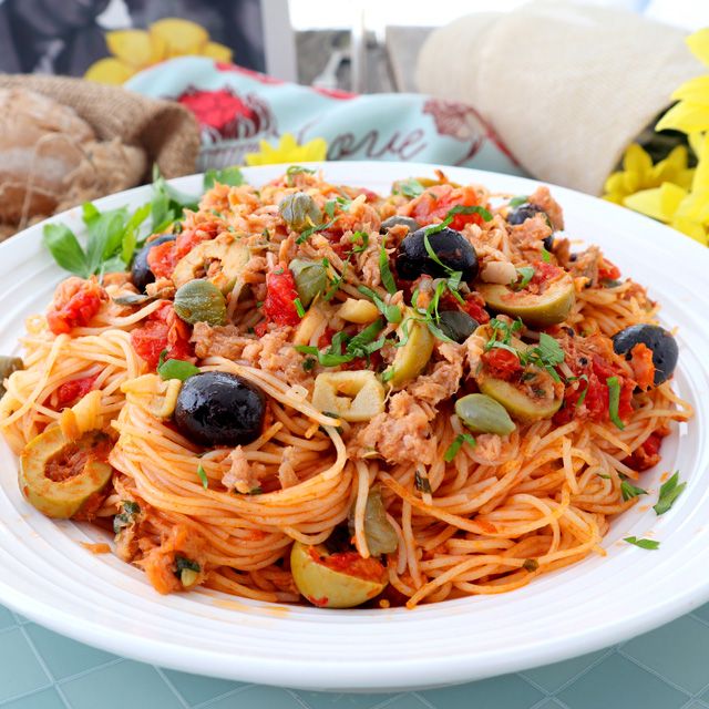 Mediterrane Spaghetti mit Thunfisch, Oliven und Kapern