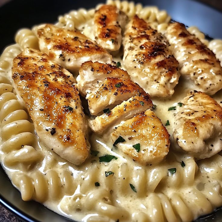 Ein cremiges, herzhaftes Pastagericht mit zartem Hähnchen, Knoblauchbutter und würziger …