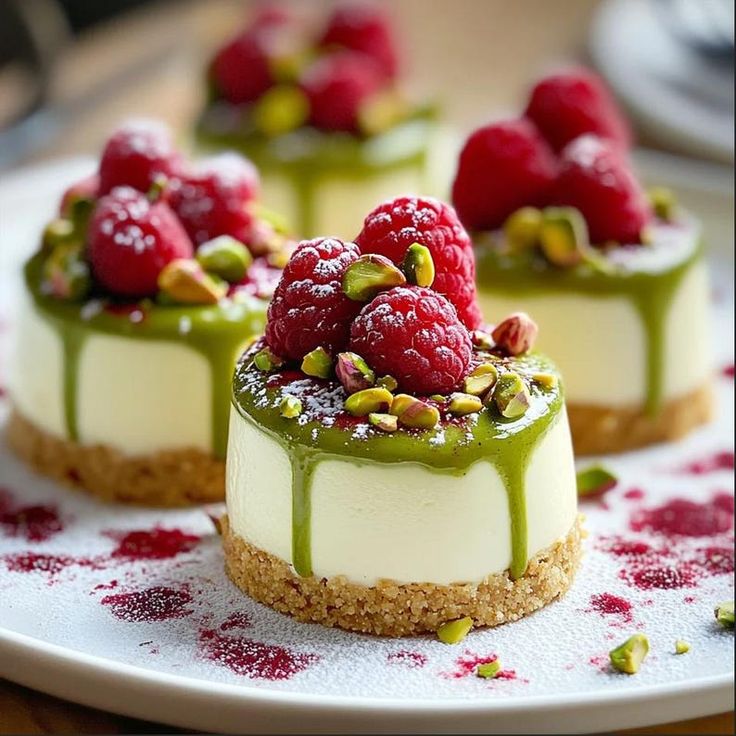 Pistazien-Himbeer-Käsekuchen-Kuppeln Für die Käsekuchen-Füllung: 250g Frischkäse (erweicht) 🧀100 g Puderzucker …