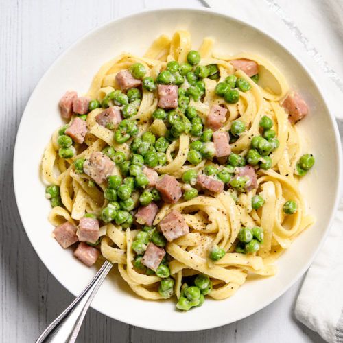Spaghetti alla Panna in Käse Sahnesauce mit Schinken und Erbsen