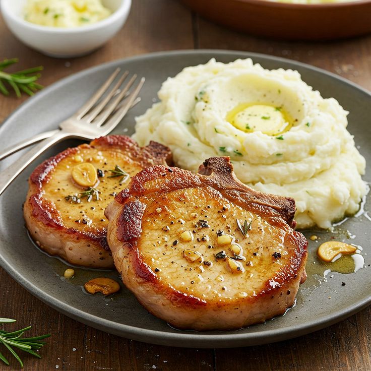 Butterige Knoblauch-Schweinekoteletts mit cremigem Kartoffelpüree